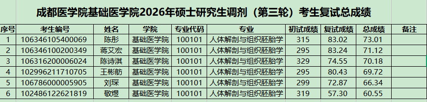 成都医学院基础医学院2026年硕士研究生调剂(第三轮)考生复试总成绩